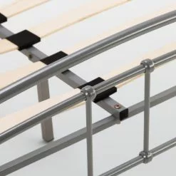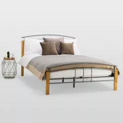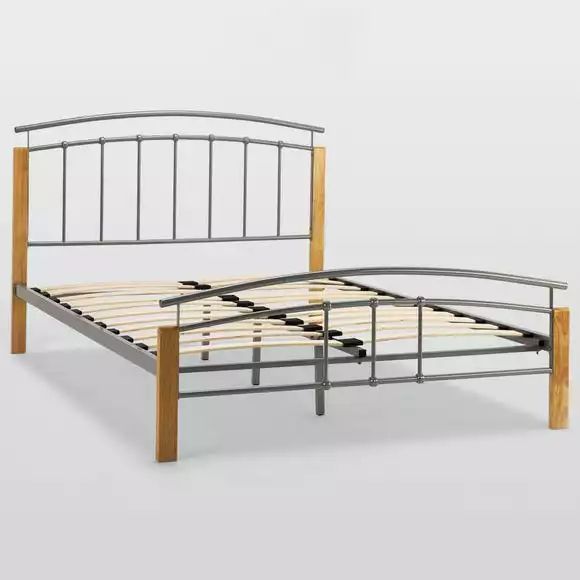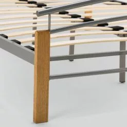 A modern bed frame with silver framework, beech posts and a slatted bed base. This contemporary bed frame will make a great centrepiece to any modern room. The silver framework and beech posts contrast beautifully while the simple yet stylish design creates a truly stunning effect.