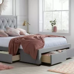 With its striking diamond tufted headboard, the Woodbury Fabric Bed Frame will complement any bedroom. This elegant bed frame features handy storage drawers, making it a practical option too.