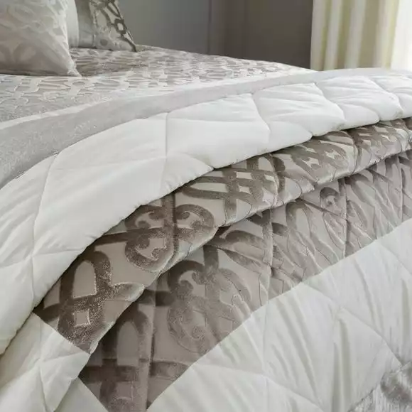 Beautifully textural and soft to touch, this bedspread will not only add comfort to your bedroom but will add a touch of class too. The lattice detail on the devore velvet panel is perfect for creating a luxurious but relaxed bedroom. Other matching bedroom accessories and bedding is available.