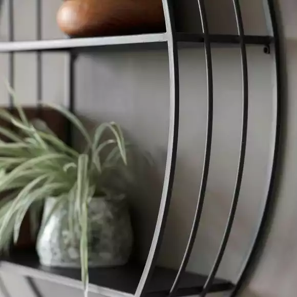 Combining style and functionality, the Marlo Round Metal Wall Storage Unit conveys contemporary design with a hint of art deco as it features a matt black metal frame and shelves for clear and contained storage and display.