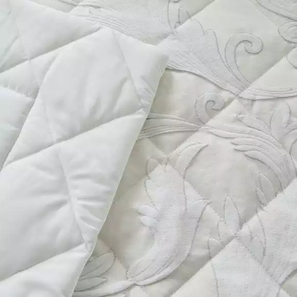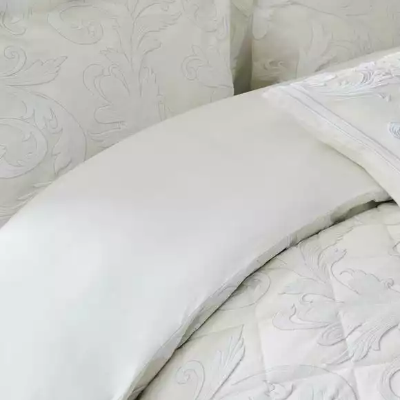 Resplendent large scale scrolls are woven into a decorative raised cream jacquard design on this opulent Dorma Acanthus bedspread in a classic cream colourway. Filled with 100% polyester for durable wear, this bedspread is covered in a sumptuous cotton blend fabric and is machine washable, with coordinating bedding and accessories available sold separately.