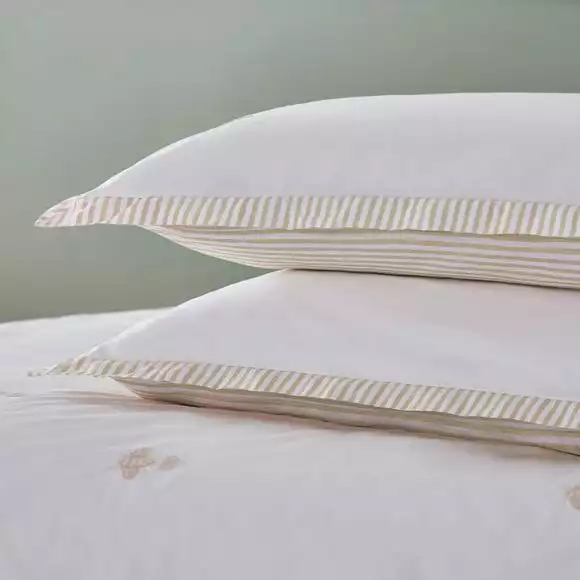 Crafted in 100% cotton percale for a luxurious feeling, this charming regal embroidered bee design features a colour woven stripe pattern reverse which can allow for interchangeable styling where desired. The duvet cover is finished with a secure zipper fastening which is quick to use. A coordinating pillowcase pair, fitted sheet and valance are available.