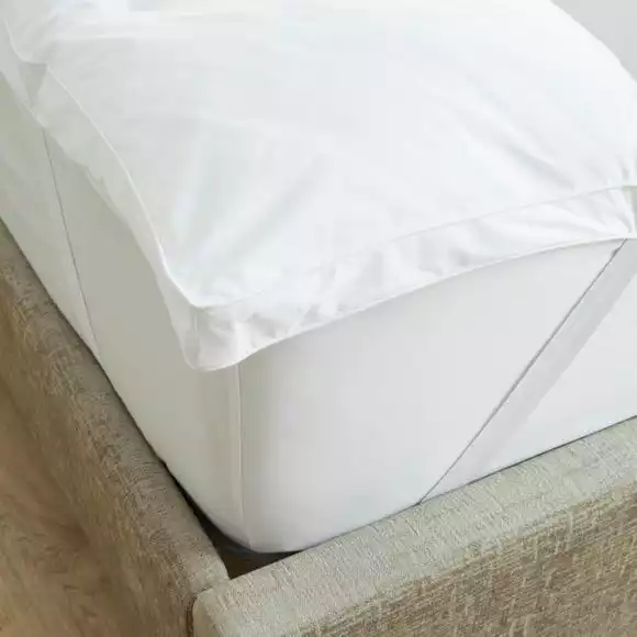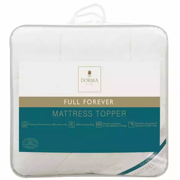 Available in a selection of sizes, this luxurious Dorma mattress topper has a crisp 100% cotton cover with a premium 230 thread count and fits mattresses up to 30cm deep. Filled with 100% spiral fibre for a fuller and plush feel with cassette construction for even distribution of the filling, this topper has elasticated cover straps to securely fit over your mattress.