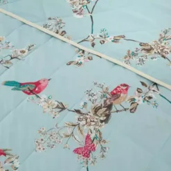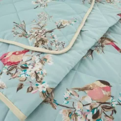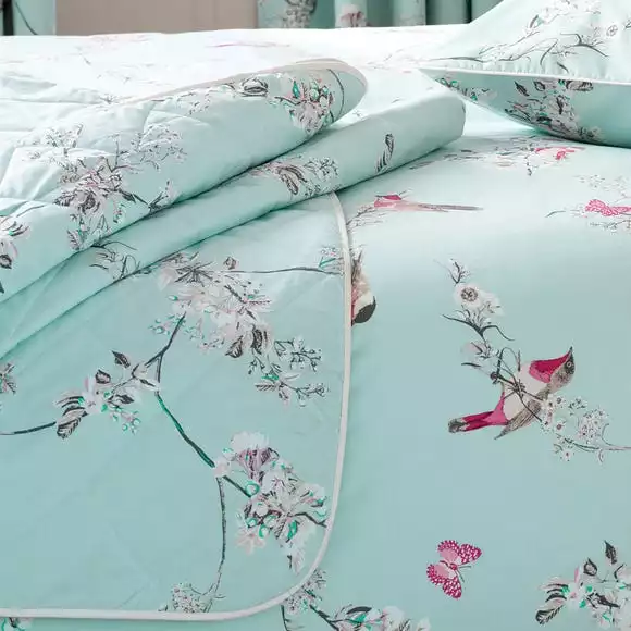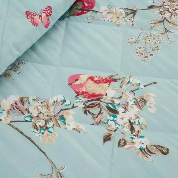 Crafted from a soft polycotton blend and finished with piped edging in white, this duck-egg blue bedspread from the popular Beautiful Birds collection is patterned with a design of pink and white flowers that will compliment your beautiful birds bedding. This bedspread is machine washable for easy care.