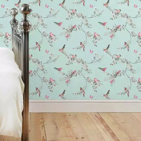 This duck-egg blue wall paper is decorated with a colourful bird and floral design and is finished with a matt effect.