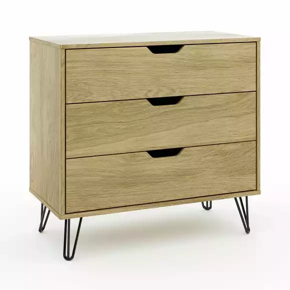 The Bella 3 Drawer Chest Oak Effect has it all, from the classic hairpin leg design to 3 spacious drawers and an oak effect finish, this is a beautiful addition to your bedroom and will look great with any colour scheme.