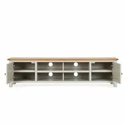 Perfect for keeping your consoles and media collections organised, the Bromley Extra Wide TV unit comes complete with four open shelf spaces, each with a convenient cable aperture, and two ample sized cupboards.