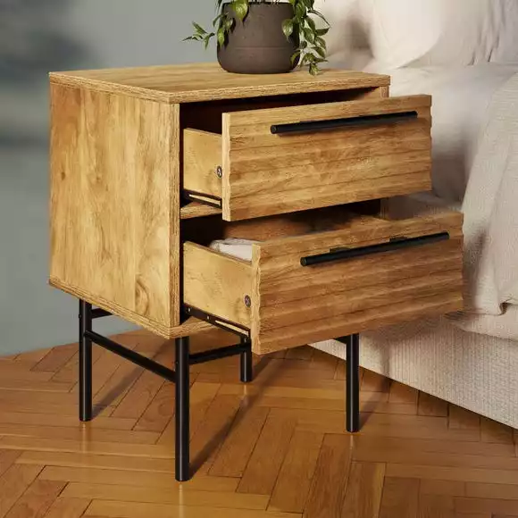 Add some fun and style to your home with this gorgeous Bryant 2 Drawer Bedside! Featuring a ribbed drawer front detail and a single shelf, this stunning bedside also has black metal handles and sleek metal legs. Ideal for any living room or bedroom, it’s the perfect addition to add extra storage while creating an eye-catching focal point in your home.