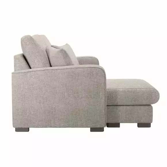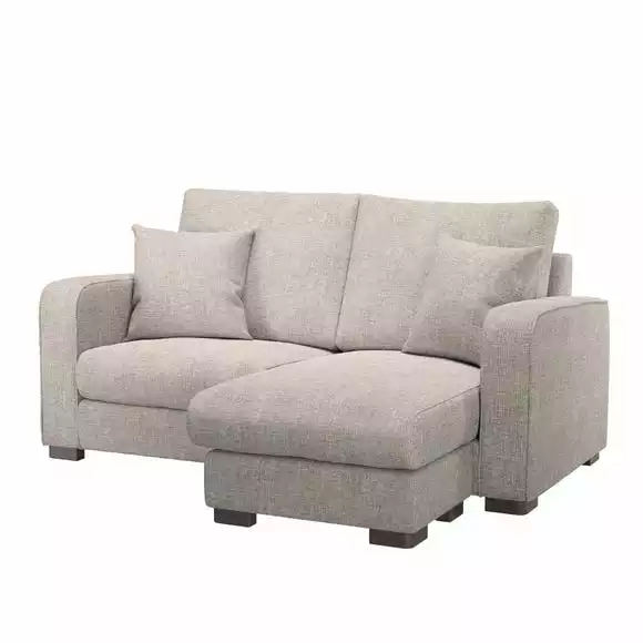 Designed with comfort in mind, the Carson Small Corner Chaise would make a welcome addition to any home and is especially ideal for smaller living room spaces. It comes with an adjustable footstool so that you can easily move it to the left seat or right seat to create a chaise. Boasting sprung, foam-filled extra deep seats, and fibre-wrapped foam back cushions, this sofa is the perfect place to sink back into after a long day. This stylish sofa features soft and hard-wearing chunky chenille upholstery and styled with a piped edge detailing and complementing dark wooden feet for a sophisticated look. This sofa also features removable cushion covers for easy care, and is supplied with two matching scatter cushions.