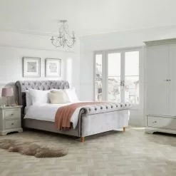 Elegantly crafted with a natural lacquer coating, the Charlotte range features a soft light grey with a stylish grooved finish. Designed to host a range of interiors, this range comes complete with contrasting round metal handles.