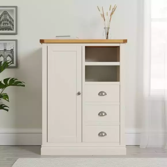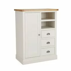 Inspired by clean and simplistic styling with a natural look that will complement a host of interiors, the charming Compton range features natural solid oak and thick oak veneer tops accompanied with an elegant Ivory painted finish. Crafted with classic antique silver round handles, this range is designed with solid pine wood legs.