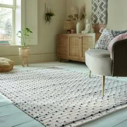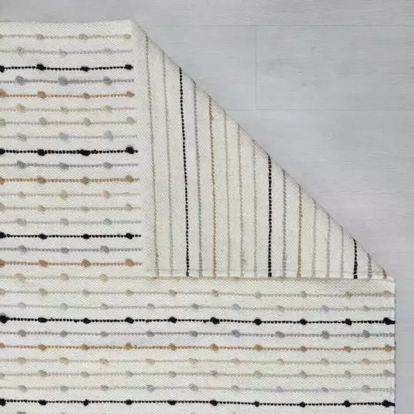 This is a hand-made flatweave rug. When opening, re-roll your rug pile out and leave in a warm room for 24 hours before putting in place, this will help to reduce wrinkles and curling from packing. Do not pull any loose threads, please cut them carefully with scissors to remove. Avoid prolonged exposure to direct sunlight as this may cause fading of the colour. Turn your rug regularly to ensure even wear and to reduce pressure marks from furniture. Wool fibres may shed when new and during use, this is a characteristic of this product and is not a defect and should reduce with normal use and regular vacuuming. Before using any cleaning products on your rug, test on an inconspicuous area first to ensure it does not affect the colour. Clean spills immediately by blotting with a clean dry white cloth – do not rub as this may stain the fibres. Vacuum your rug regularly to remove everyday dirt, we recommend the use of a suction type vacuum cleaner as a rotating vacuum brush can cause damage to the pile surface. We recommend the use of an anti-slip mat beneath your rug to prevent it from slipping and sliding out of place. Latex is used on the back of this rug. Please do not leave babies or young children unsupervised on this rug.