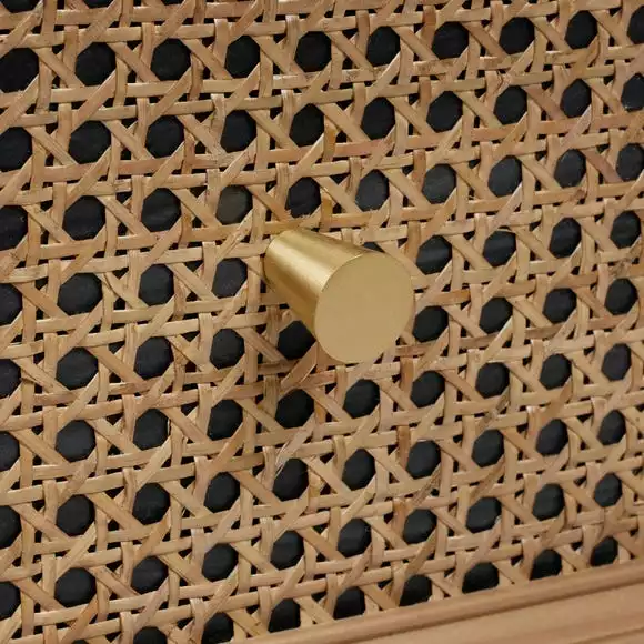 Get rid of monotony and bring in a dose of boho styling to your bedroom with the Franco Bedside table. This stylish yet practical piece of furniture offers an ample amount of storage space with the 2 drawers, decorated with a super on trend rattan cane material. Combined with the contrasting black surround and brushed gold effect handles, this bedside table is to die for and is bound to make a reappearance on your Instagram feed. This piece pairs beautifully with both traditional and contemporary décor, however would look perfect styled with other neutral and natural finish items such as dried flowers and candles.