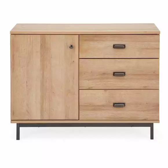 Elegantly crafted with a single cupboard equipped with two fixed shelves and adjustable hinged door, this stunning sideboard features three ample-sized drawers complete with metal extension runners and pull-out stop.