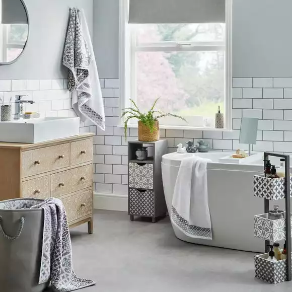 With a stylish global inspired geo design, this three tier two drawer unit is handy for storing away your bathroom accessories when not in use, without compromising style. Coordinate with our matching Geo Tile accessories.