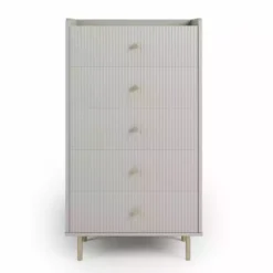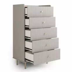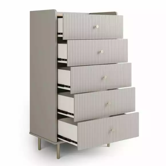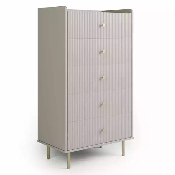 Equally glam and modern, our Georgi 5 Drawer Chest draws the eye with its striking textured front set against a stylishly simple frame. This chest is finished with matte gold finish handles and legs for a truly contemporary luxe look.