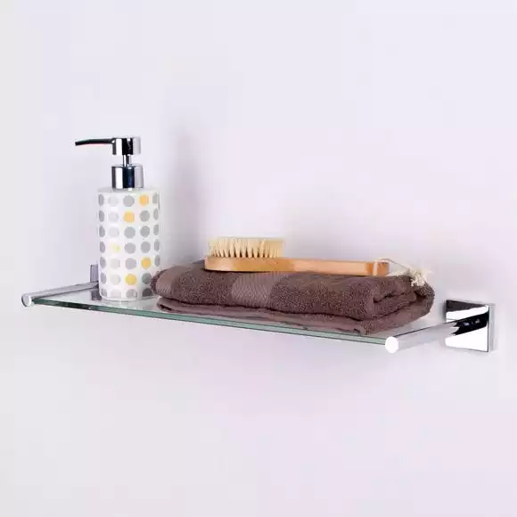 This glass shelf features stylish chrome square wall attachments crafted from metal. Ideal for storing all of your bathroom essentials. Coordinating items available.