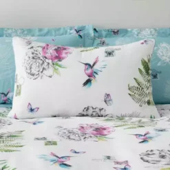 Finished with a soft handle to offer high levels of comfort, the Heavenly Hummingbird duvet cover set is printed with a beautiful floral design scattered with pink hummingbirds and butterflies. White on one side, this duvet cover set offers a stylish duck egg reverse and is complete with duck egg blue piped edges for a sophisticated and decorative finish. This set comes with pillowcase/s included and is available in a range of sizes. Matching items are also available.