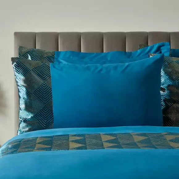 Inga is a design that features a beautiful printed velvet panel. This duvet cover and pillowcase set comes in a solid peacock colour and glamorous gold details within the velvet panel. A 100% polyester composition gives the material a soft hand feel. Fully machine washable.