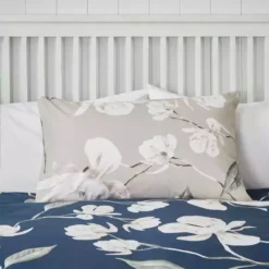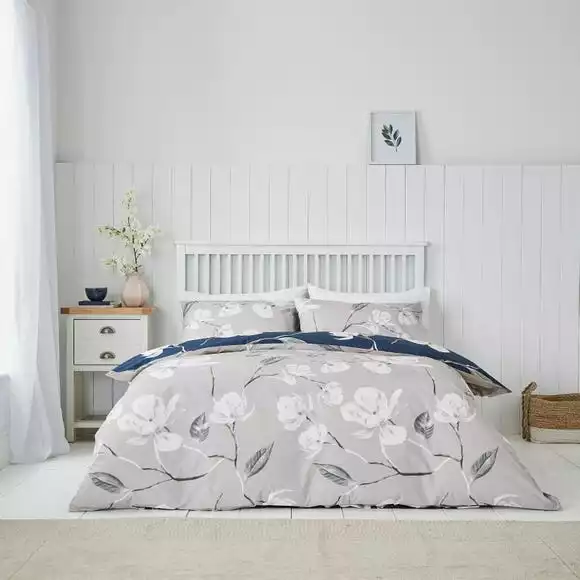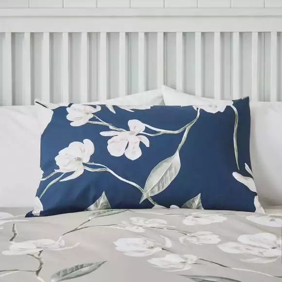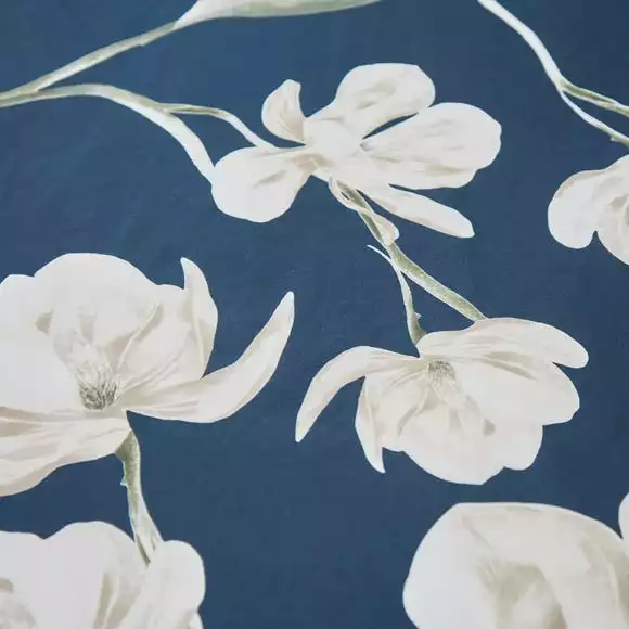An oriental feel floral printed design cascades across this duvet cover. Featuring a rich navy colourway, the front will add a stylish look into your bedroom. A natural ground reverse provides the option for a style change when desired. Crafted from a polycotton material, the set is easy to care for and is fully machine washable. The duvet cover set has been finished with a recycled plastic button closure which helps secure the cover around the duvet whilst in use.