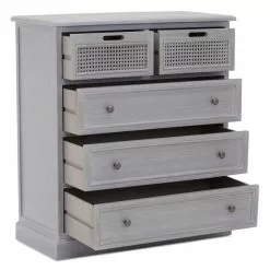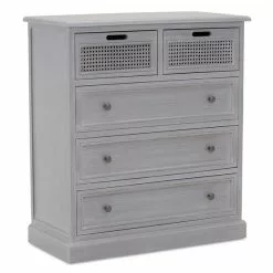 This fully assembled chest of drawers features three ample-size drawers with dark round handles and two smaller drawers to provide a generous amount of storage space.
