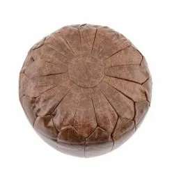Boasting a Moroccan inspired design, this round pouffe is crafted with stitched faux leather panels in a tan brown colourway.