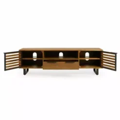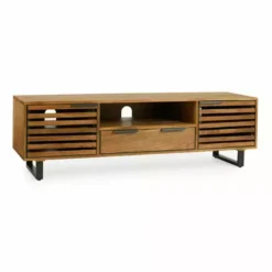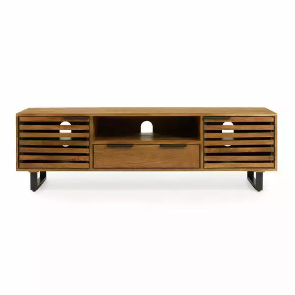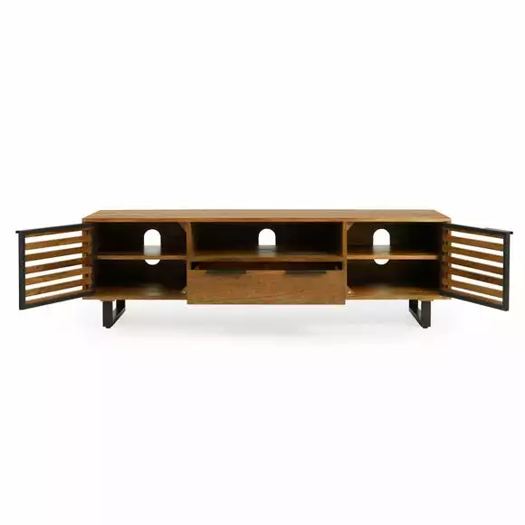 Offering plenty of convenient storage space, the Orsen extra-wide TV stand comes complete with contrasting black metal legs and handles, and cable apertures in each shelf for keeping your living space organised. The slatted doors on the two spacious cupboards create an appealing look whilst still allowing the use of remotes without having to open the doors, so you can easily hide away any consoles or media devices.