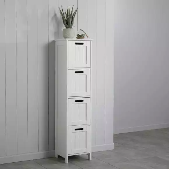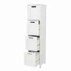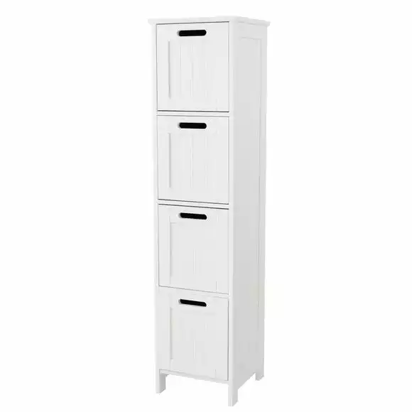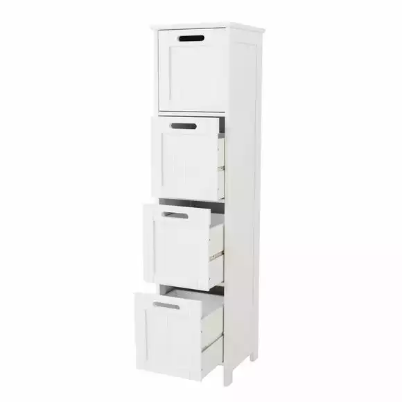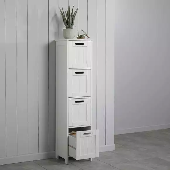 This simple and stylish 4 drawer storage unit is an ideal storage solution for your bathroom. With 4 drawers you can store all your bathroom essentials, towels, toilet rolls, and more. The surface of this unit is perfect for displaying your bathroom ornaments, perfumes, plants, and more. This unit features a beautiful tongue and groove opening design. Fully assembly required.