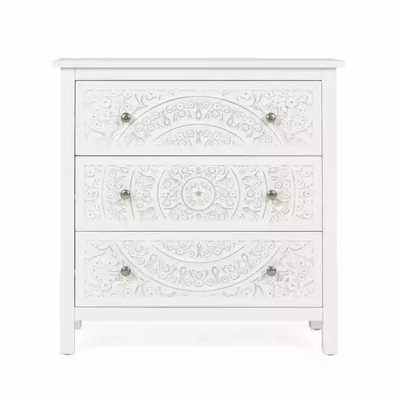 The Samira chest of drawers features three spacious drawers perfect for adding a decorative touch to your bedroom.
