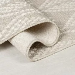 This is a hard wearing machine made rug suitable for indoor and outdoor use. When opening, re-roll your rug pile out and leave in a warm room for 24 hours before putting in place, this will help to reduce wrinkles and curling from packing. Turn your rug regularly to ensure even wear and reduce pressure marks from furniture. Do not pull any loose threads, please cut them carefully with scissors to remove. This rug is UV treated to prevent fading – however when not in use for extended periods roll the dry rug and store in a covered/shaded area. Before using any cleaning products on your rug, test an inconspicuous area first to ensure it does not affect the colour. Clean spills immediately by blotting with a clean dry white cloth – do not rub as this may stain the fibres. Vacuum your rug regularly to remove everyday dust. When using indoors we recommend the use of an anti-slip mat beneath your rug to prevent it from slipping and sliding out of place. When using outdoors please take care not to place on rough or sharp surfaces that may damage or pierce your rug. Please keep away from fire. Please do not leave babies or young children unsupervised on this rug.