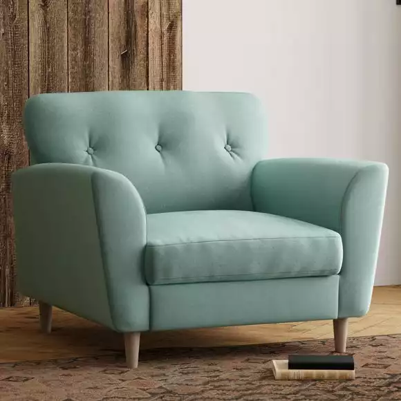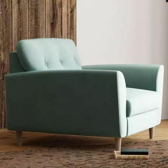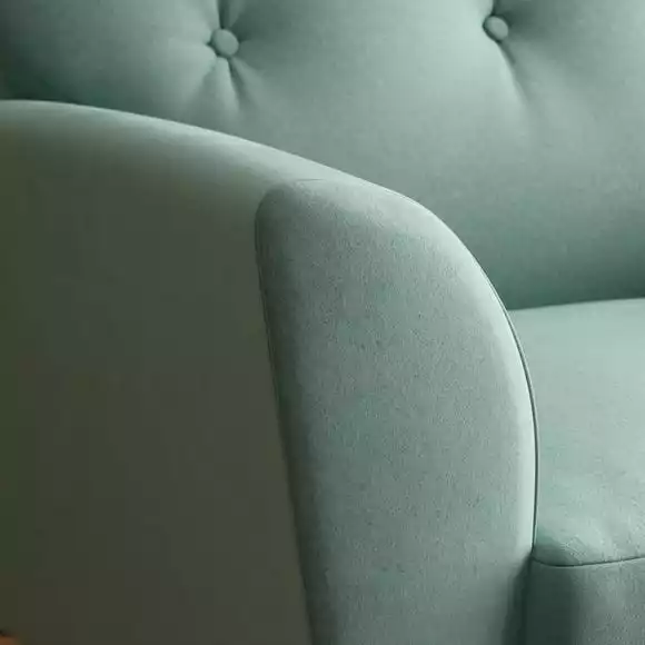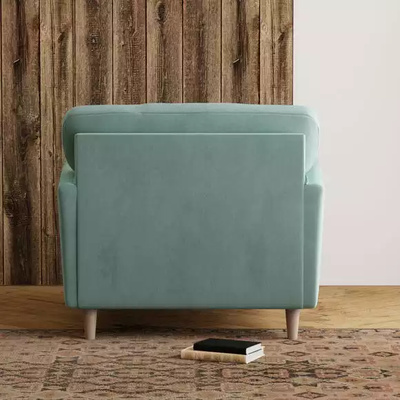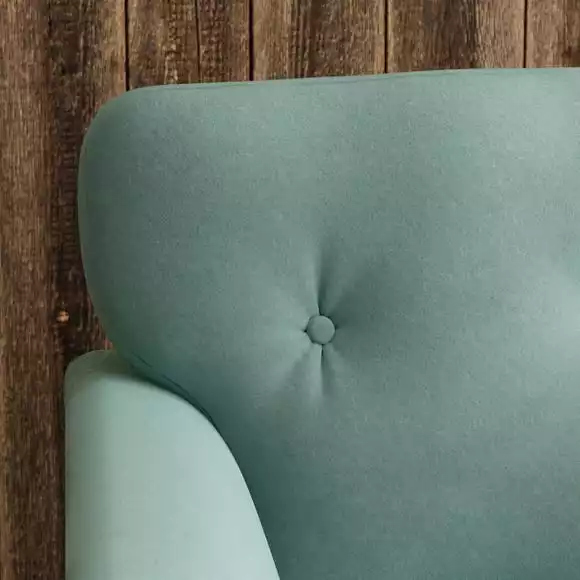 A compact snuggle chair with a modern buttoned back and soft touch velvet upholstery, this chair is made from 100% recycled polyester to ensure a low carbon footprint. Comfortable foam and fibre-wrap seat cushions allow you to relax for hours on end.