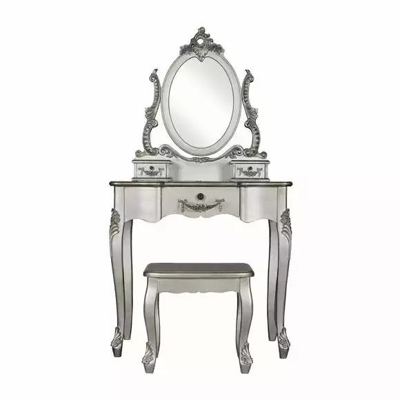 Complete with a stylish matching stool, this dressing table set features ample drawer space, with one central drawer and two smaller drawers below the mirror. Deigned with an oval, ornate, adjustable mirror, the Toulouse dressing table set is finished with a solid pine frame and legs for durability.