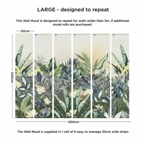 Featuring a warm and colourful vintage inspired tropical leaf design, this wall mural is perfect for creating a beautiful feature wall in any room. Boasting easy paste the wall application and a wipe clean surface, this mural is also designed to repeat for walls wider than 3m if additional mural rolls are purchased.
