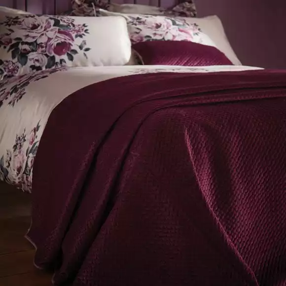 This glamorous plum coloured bedspread is crafted from soft touch 100% polyester with a pinsonic technique and is machine washable for easy care. It matches our Violet bedding set and coordinating plum accessories perfectly to complete the look.