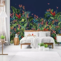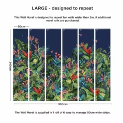Smooth finish wallpaper with matt inks, this Voyager Mural features an exotic botanical design. Easy to hang, you are required to paste the wall and apply the paper. This application method is time saving compared to traditional wallpapering methods.