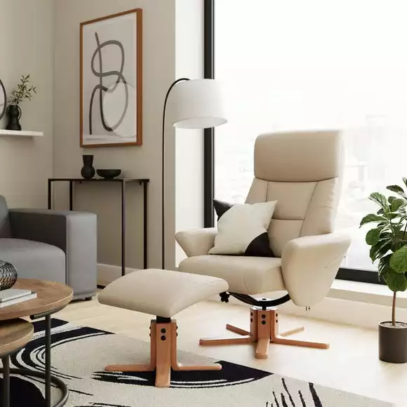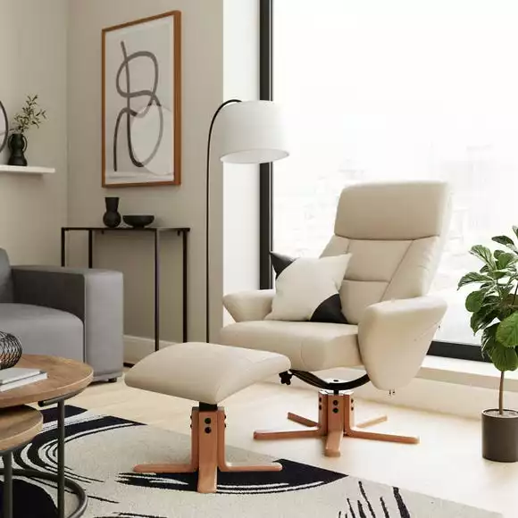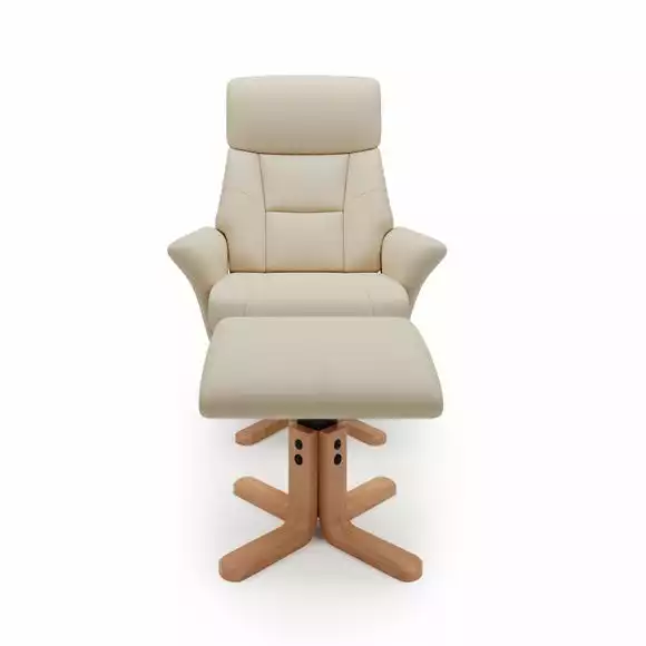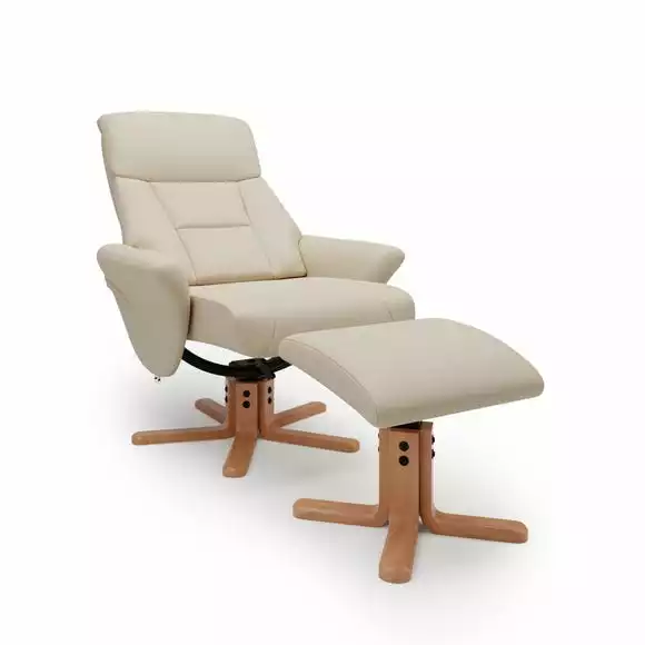 Beautifully crafted, this self-assembly swivel chair is upholstered in a soft faux leather fabric and features a padded headrest and deep set padded back to provide utmost comfort. Designed in a natural colourway with wooden legs, this recliner chair is supplied with a matching footstool.