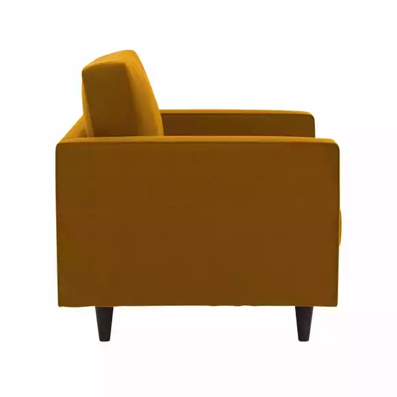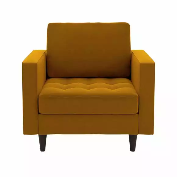 Bring some modern retro styling to your living room with the stylish Zoe Armchair. Available in a choice of bright and trendy colours, this chair features soft touch velvet upholstery, styled with a gorgeous tufted seat cushion, piped edge detailing and stylish tapered solid wood legs. As stylish as it is comfortable, the Zoe is the perfect place to sit back and unwind, featuring a foam filled, sprung seat and fibre filled back cushions. Made with recycled materials. This armchair has a non-reversible back cushion and a fixed