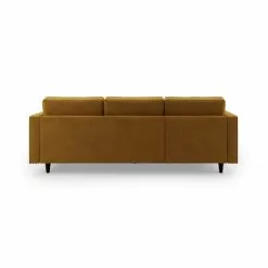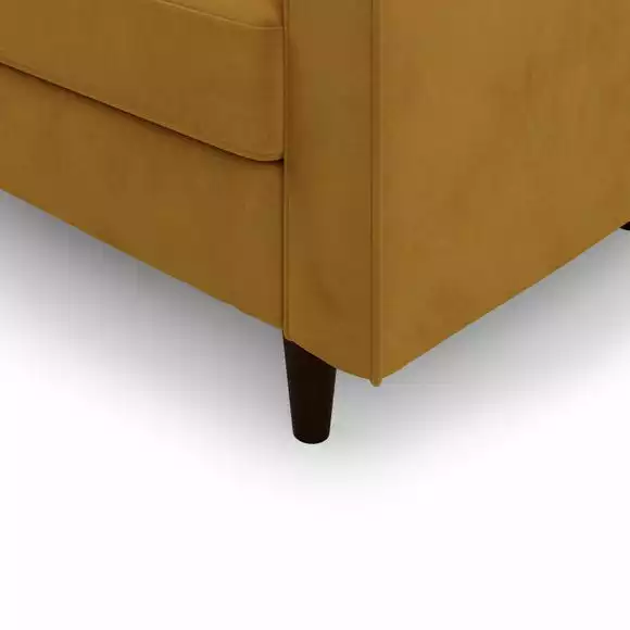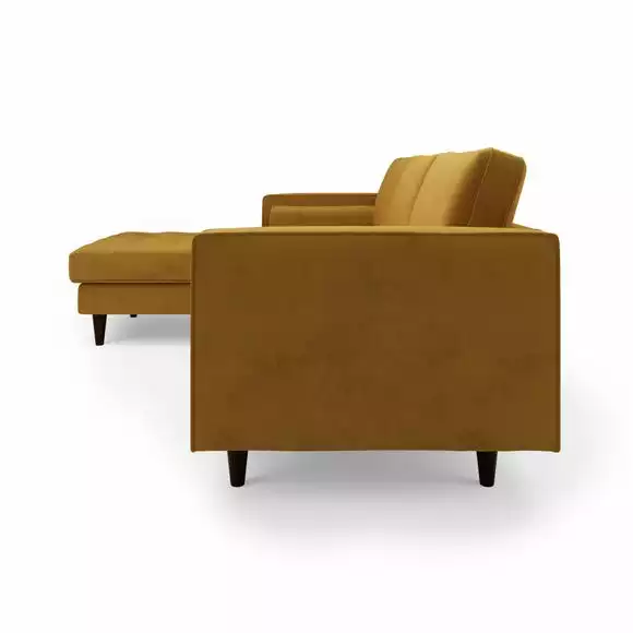 Bring some modern retro styling to your living room with the stylish Zoe Left Hand Corner Sofa. Available in a choice of bright and trendy colours, this sofa features soft touch velvet upholstery, styled with a gorgeous tufted seat cushion, piped edge detailing and stylish tapered solid wood legs. As stylish as it is comfortable, the Zoe corner sofa is the perfect place to sit back and put your feet up, featuring a foam filled, sprung seat and fibre filled back cushions, as well as two matching bolster cushions to boot. Made with recycled materials. This corner sofa has non-reversible back cushions and fixed seat cushions.