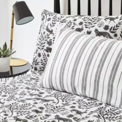 Gain an impossibly comfortable sleep with this duvet cover set is composed of 100% cotton which has a digitally printed design. The design features a minimalist Scandinavian woodland print with a striped reverse. A clear button closure allows an easy duvet cover removal.