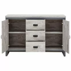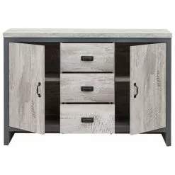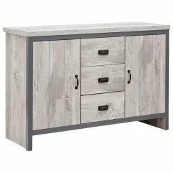 Boasting a bold industrial-chic design, the Boston sideboard is perfect for brining a contemporary design statement to your living space. This modern sideboard boasts a chunky construction and features adjusatable shelves so you can make the most of the storage space. The symmetrical form incorporates a central column of drawers, flanked by a pair of cupboard doors. The industrial look is accentuated by the distressed grey finish with contrasting black metal handles and dark grey wooden frame.