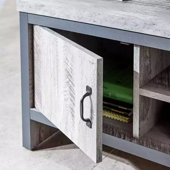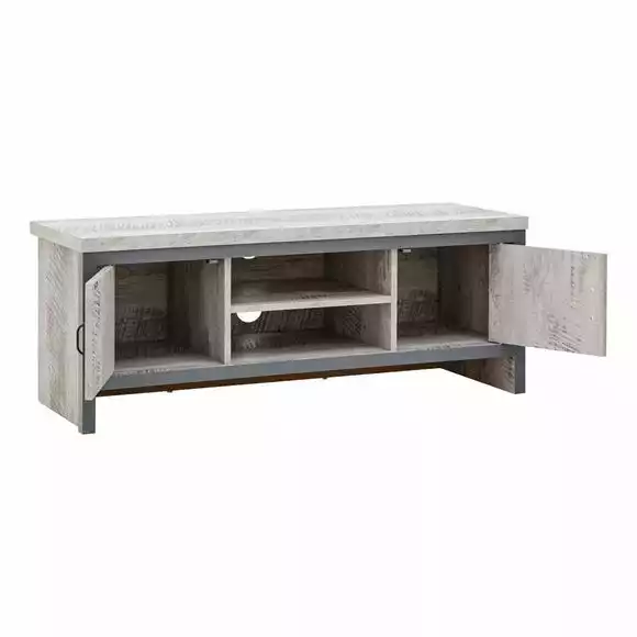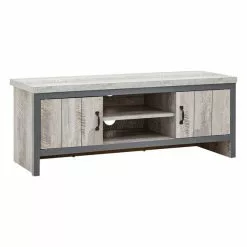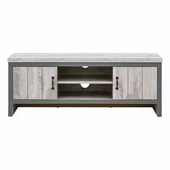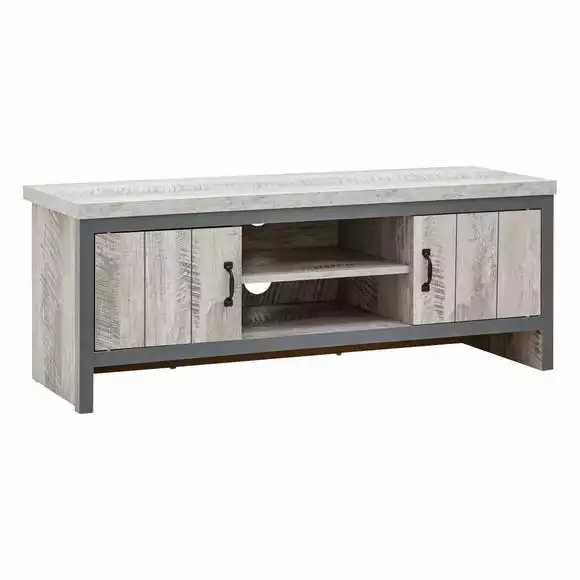 Boasting a bold industrial-chic design, the Boston TV Stand is perfect for brining a contemporary design statement to your living space. This modern unit boasts a chunky construction and features two open shelves for media devices with wide cable apertures as well as two spacious cupboards with magnetic catches. The industrial look is accentuated by the distressed grey finish with contrasting black metal handles and dark grey wooden frame.