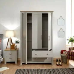 The Lancaster Triple Wardrobe boasts a stylish shaker-inspired design that’s perfect for kitting out a bedroom in first-class style. The sleek lines, soft grey or cream foiled finish with oak-effect tops and brushed steel handles create a sophisticated impression. The wardrobe provides effective storage with a good mix of hanging, drawer and shelf space – Ideal for a room where understated elegance is the goal.