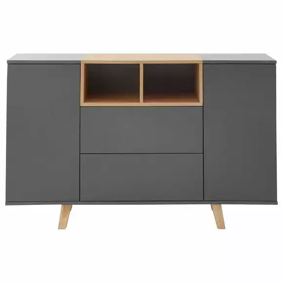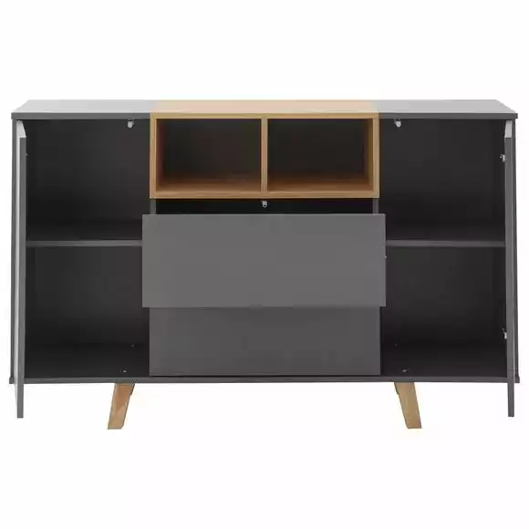 Crafted with a modern Scandi design, the Modena sideboard offers plenty of useful storage space and would be a great addition to any modern space. This self-assembly sideboard features pop-out push-pull door and drawer mechanisms so there are no handles to spoil the clean lines of this elegant piece of furniture, and is finished in a durable, scratch-resistant slate grey melamine with a contrasting oak effect centre. The sideboard is supported by four sturdy, retro Scandi-style legs and boasts two spacious cupboards with centre shelves, two open storage cubes and two large drawers.