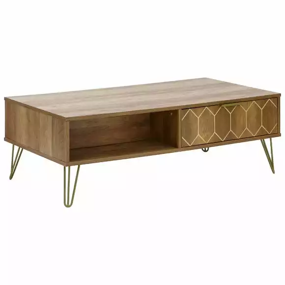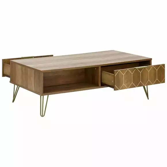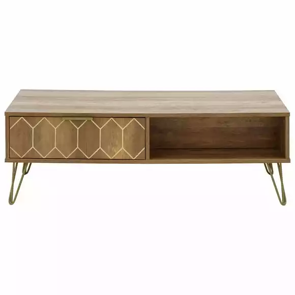 Add a touch of understated glamour to your living space with the retro-inspired Orleans Coffee Table. The simple mango-effect construction creates a warm, neutral palette that’s enhanced by delicate engraved metallic detail in a modern geometric design. Featuring a slender drawer and open display compartment to each side, this coffee table comes complete with neat gold-coloured drawer pulls that perfectly complement the elegant hairpin legs.