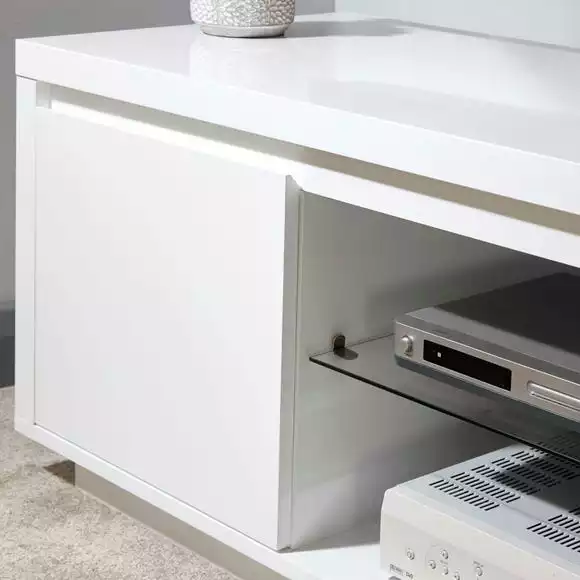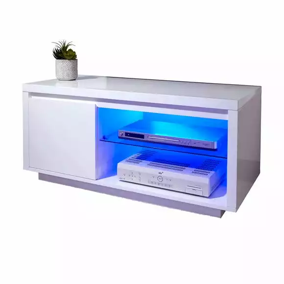 Perfect for any modern living space, the Polar LED TV unit is available in grey and white and features a moisture-resistant high gloss finish and is supplied with battery-operated LED lights, perfect for illuminating items stored beneath or to provide a subtle mood lighting. This self-assembly TV stand features two fixed open shelves, each with cable access and a spacious cupboard.