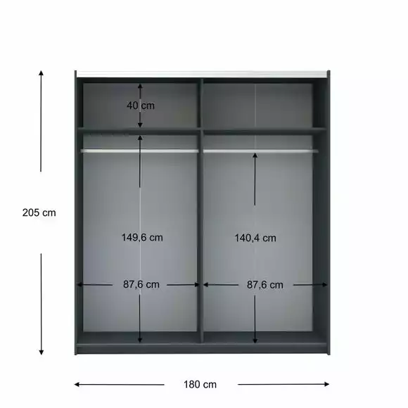 A modern wardrobe that deserves a place in your home. Crafted with a German engineered track system, you can be sure that this modern sliding wardrobe glides open and closed with ease. Its two spacious hanging rails are ideal for your favourite clothing items, while the additional shelves provide extra storage space – perfect for any home!