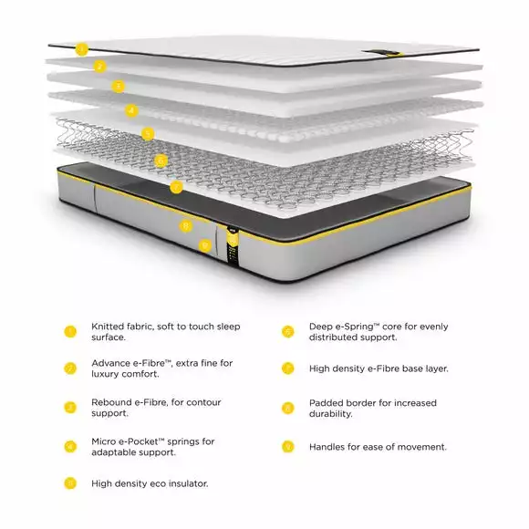 The soft knitted fabric mattress is cleverly made of a deep e-Spring™ core to evenly distribute the support across your entire body when sleeping. Alongside micro e-Pocket™ springs which adapt to your body whilst providing you with brilliant support.