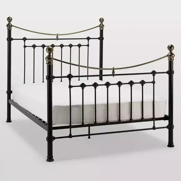 Crafted with a curving head and footboard with stylish bars and bedknobs, this metal bedstead features a satin black finish with brass detailing and is available in a choice of sizes.