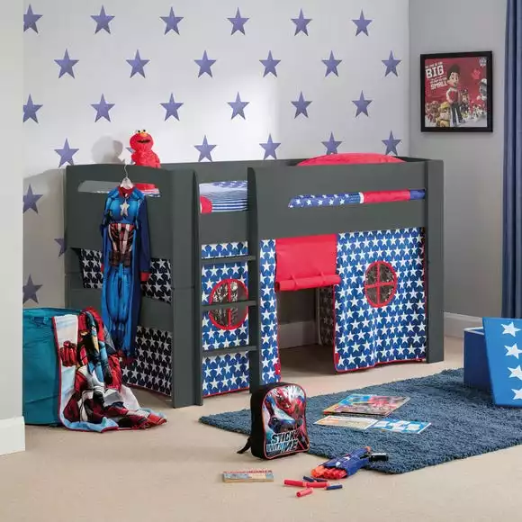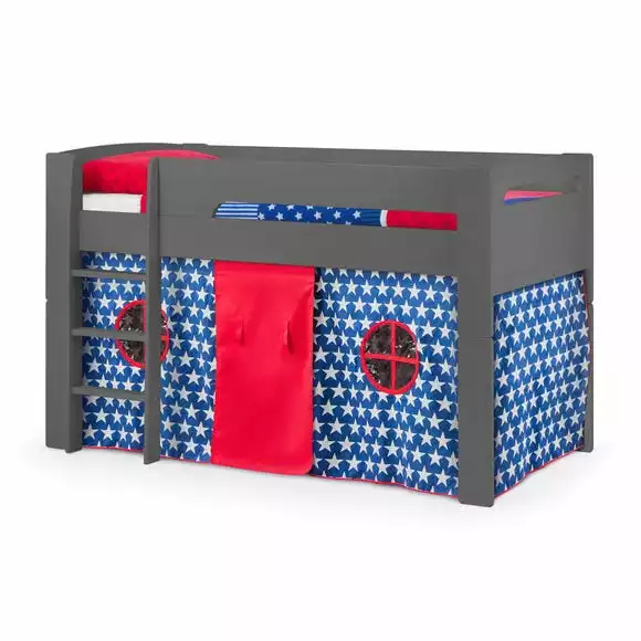 Take your child off to the moon and back with this imaginative Pluto Midsleeper with Blue Tent. Transform your child’s bedroom with the Pluto mid-sleeper bed. This fun and vibrant bed frame comes complete with a Pluto star tent, making it ideal for encouraging your child to stray away from their TV or computer, and instead play within their own little world. The sturdy base is designed with solid wood slats, ensuring strong support for growing children who need a sturdy foundation for all the fun they will have in this fantastic raised bed. The Pluto Midsleeper with Blue Tent is also designed for future flexibility – it can be converted to a single bed later on if required, making it an ideal bed for your growing child.