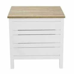 Fitted with a light oak effect hinged lid, this white laundry hamper has a slatted design at the front, is crafted with side carrying handles, and is quickly and easily assembled. This hamper features one hinged door.